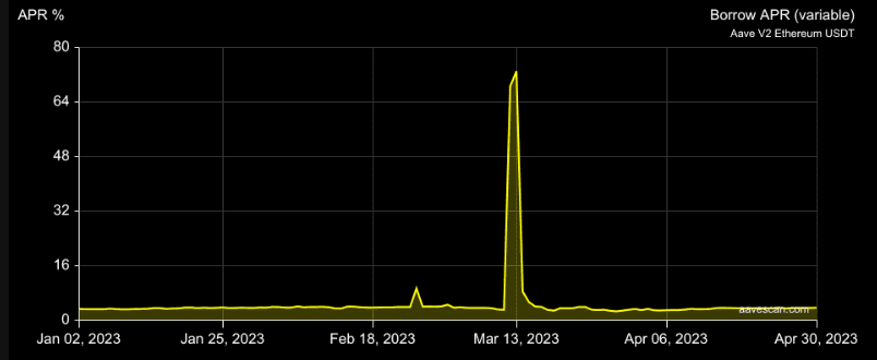 On March 11, 2023, during the USDC depeg, Messari reported that USDT borrowing on Aave’s Ethereum v2 market briefly hit 87% APR.
